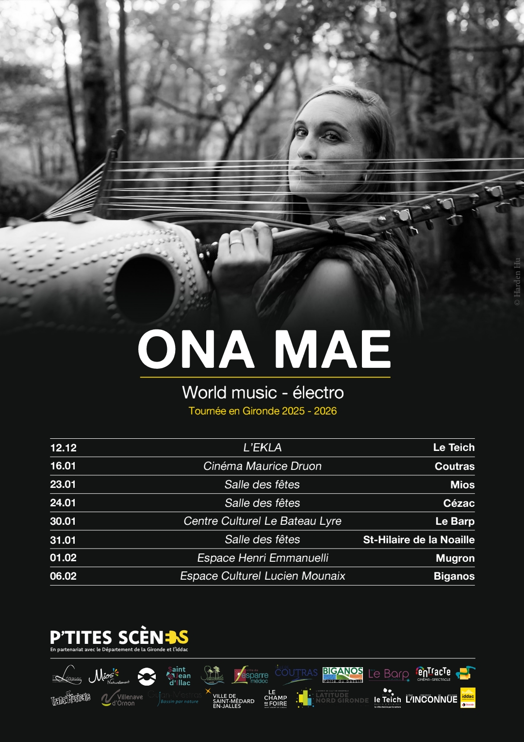 - Sélectionnée dans les cadre des P'tites Scènes, dispositif / réseau regroupant des communes et associations musicales partenaires et initié par l'iddac, Ona Mae a été retenue pour 8 concerts en Gironde du 12 décembre 2025 au 6 février 2026, à l'issue d'une résidence de création du 8 au 12 décembre 2025 à L’EKLA au Teich.